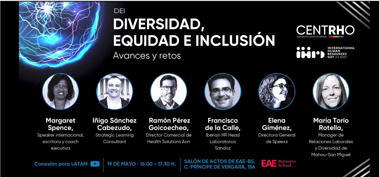 ¿Te perdiste el pasado 19 de mayo el encuentro que AEDIPE CENTRHO organizó por el Día Internacional de los RRHH? En dicho encuentro participamos Margaret Spence y yo, como parte de un panel de expertos en Diversidad e Inclusión junto con Elena Gimenez, Directora de Speex, Maria Torio, Directora de Relaciones Laborales en Mahou-San Miguel, Ramon Perez Goicoechea, Director Comercial de Health Solutions AON y Francisco Calle, Iberian HR Head de Laboratorios Sandoz.